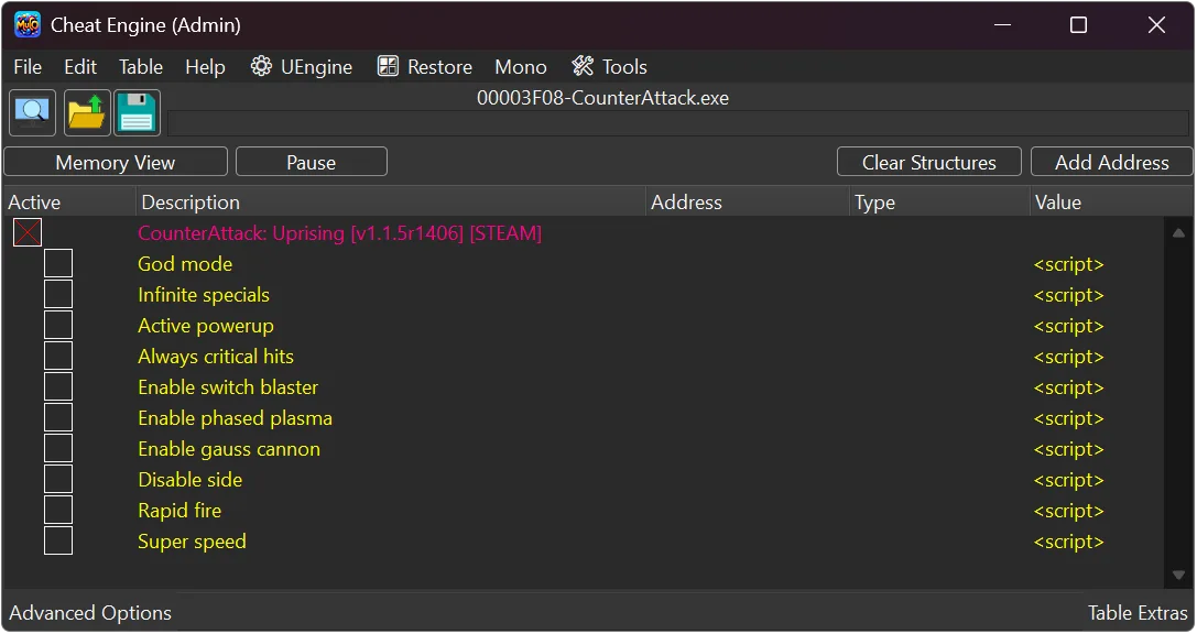 Download the Cheat Engine table for CounterAttack: Uprising and enhance your gaming experience with various gameplay modifications. This table offers numerous tweaks that allow you to customize in-game mechanics and enjoy greater control over the game. The table is compatible with version v1.1.5r1406 and works with the PC Steam version. You can change the statistics of starships and other in-game aspects.